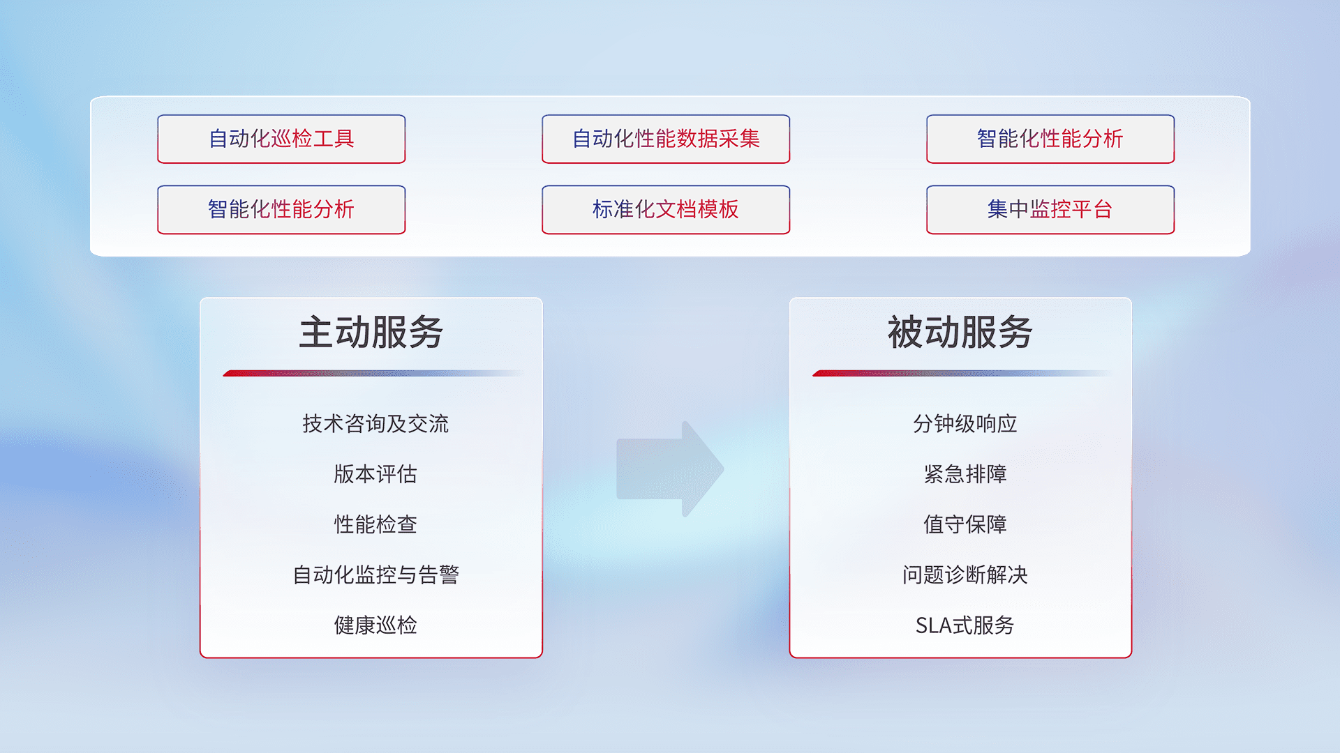 智能化工具和标准化文档,,保障服务质量,,,,提供主动服务(包含技术咨询、、版本评估、、、、性能检查、、、自动化监控与告警、、、、健康巡检)和被动服务包含(分钟级响应、、紧急排障、、、值守保障、、、、问题诊断解决、、SLA服务)。。